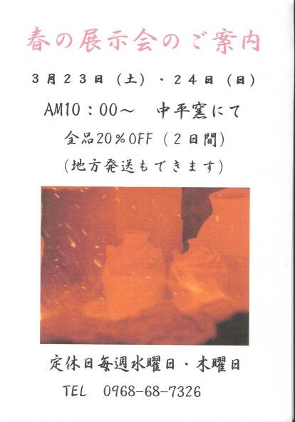 期間:平成25年3月23日(土)、24日(日) 時間:午前10時~日没 場所:熊本県荒尾市樺字中平1192番地(地図) 駐車場:20台ほど 内容:全品20%OFF(地方発送可)
