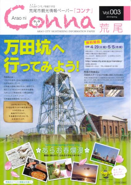 荒尾の情報誌『Conna』の第3弾が発行されました♪♪ 今回は3月~6月までの荒尾の春のイベントをぎゅーっと詰め込みました! 梨の花ウォーキングから新たまねぎ収穫体験など心もカラダもウキウキするイベント盛りだくさんです♪ 荒尾市内の観光施設などで配布しています。ぜひ手にとってご覧下さい! 【お問合せ】 荒尾市観光協会(万田坑ステーション内) 0968-57-9155