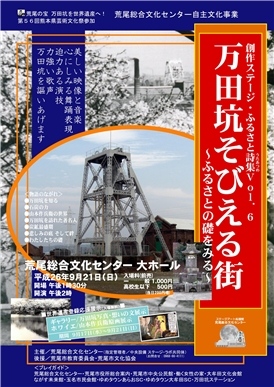 創作ステージ・ふるさと詩集(うたあつめ)Vol.6 万田坑そびえるそびえる街 ~ふるさとの礎をみる~ いよいよ今週末と迫ってきました。 【公演日】 2014年9月21日(日) 【時間】 開場:午後1時30分 開園:午後2時 【会場】 荒尾総合文化センター・大ホール 【入場料】 一般1000円 高校生以下500円(当日券は200円増し)