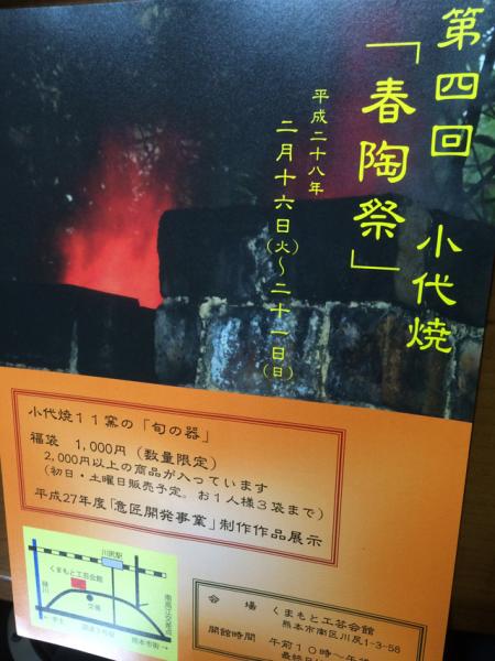 ※終了しました。 国指定伝統的工芸品である小代焼。 その小代焼の11の窯元さんの「旬の器」が展示される 第四回 小代焼き「春陶祭」がひらかれます。 第四回 小代焼「春陶祭」 期日:2月16日(火)~21日(日) 時間:10時~17時(最終日は16時まで) 場所:くまもと工芸会館 二階展示室(熊本市南区川尻1-3-58)