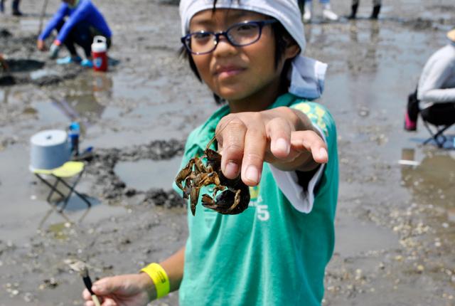 巣穴に差し込んだ筆をマジャクが押し返す習性を利用して捕まえる有明海の伝統漁法で釣りあげます。